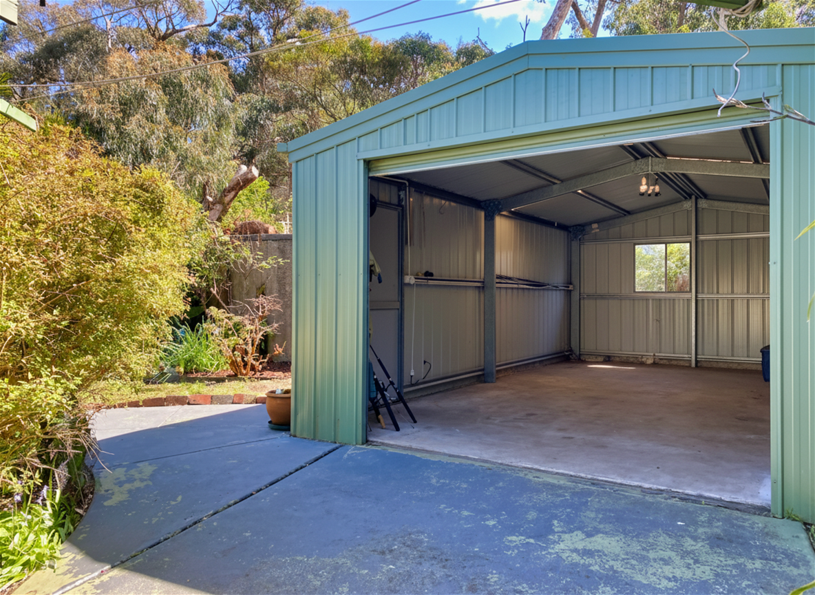 The master suite offers a walk-in robe and ensuite, while the modern kitchen with wall oven and electric hob opens seamlessly to generous dining and living areas. Comfort is assured year-round with a wood heater, reverse-cycle air-conditioning and ceiling fans. At the rear, a large deck invites entertaining beneath the trees, overlooking a lush private garden. A powered shed and double carport provide practical storage and parking, complemented by a 100,000-litre water tank and solar hot water system. Every element of the home blends practicality with charm, creating a space that feels both grounded and uplifting.