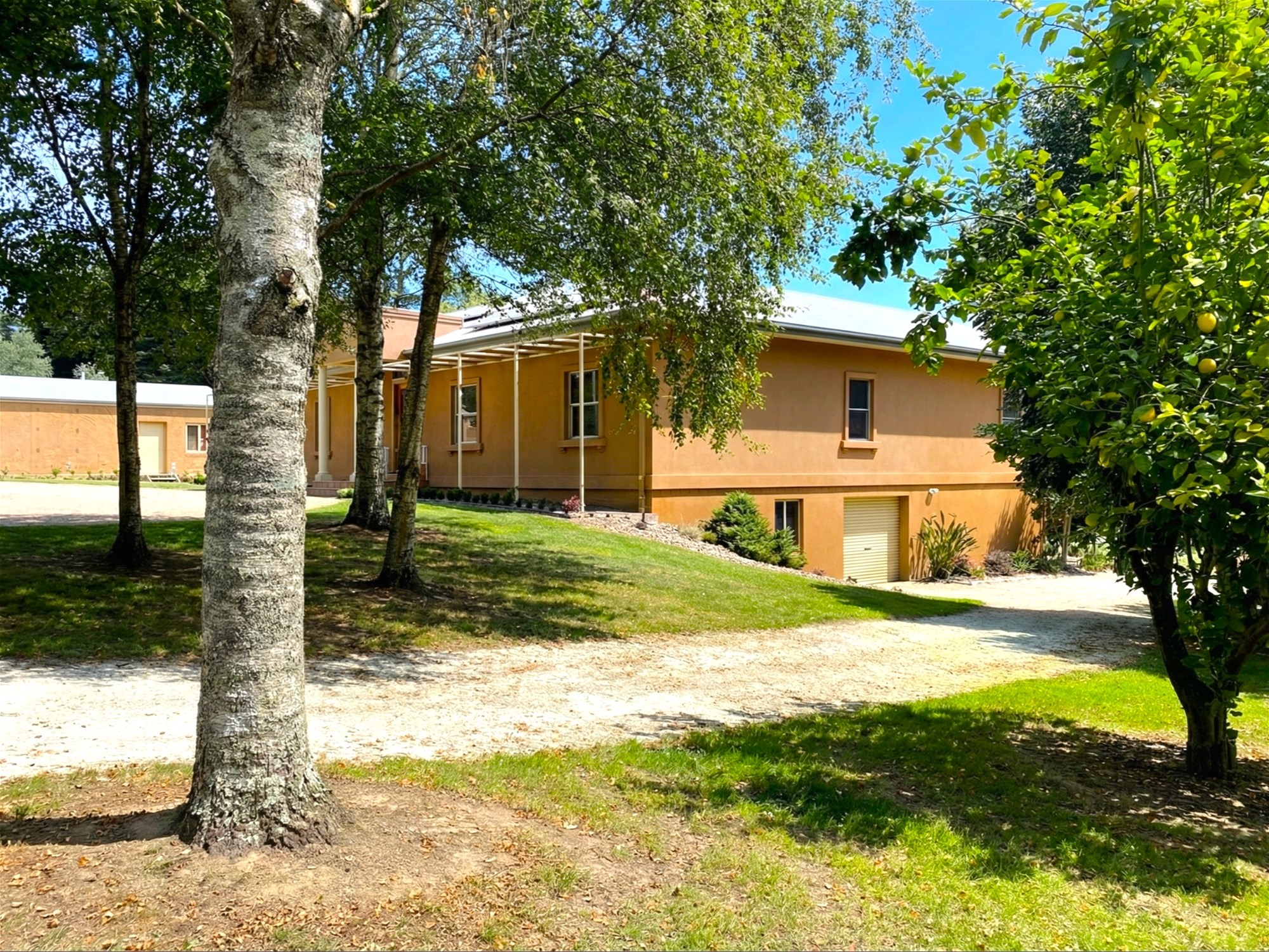Construction quality and thermal stability continue into the ancillary building, where an architecturally striking poured earth structure incorporates a double garage, an impressive studio space, and an adjoining carport with separate wood storage. The substantial poured earth walls provide natural thermal mass, helping moderate temperatures throughout the seasons and making the studio especially appealing for creative work, fitness, hobbies, workshop use or a work-from-home setup. Beautifully finished throughout, it also includes kitchenette facilities, a separate toilet and vanity area, quality lighting, considered electrical fit-out and electric vehicle (EV) charging.