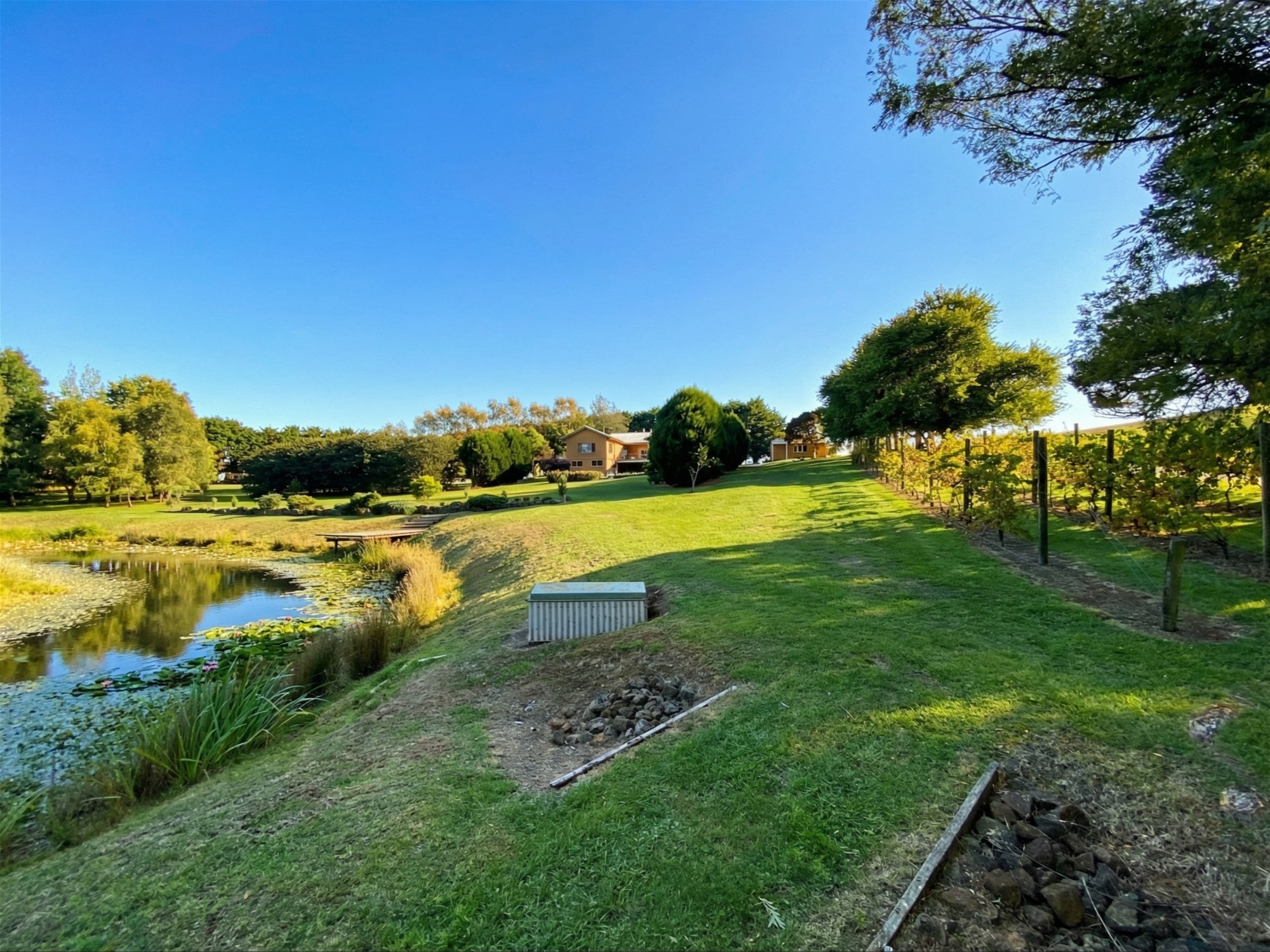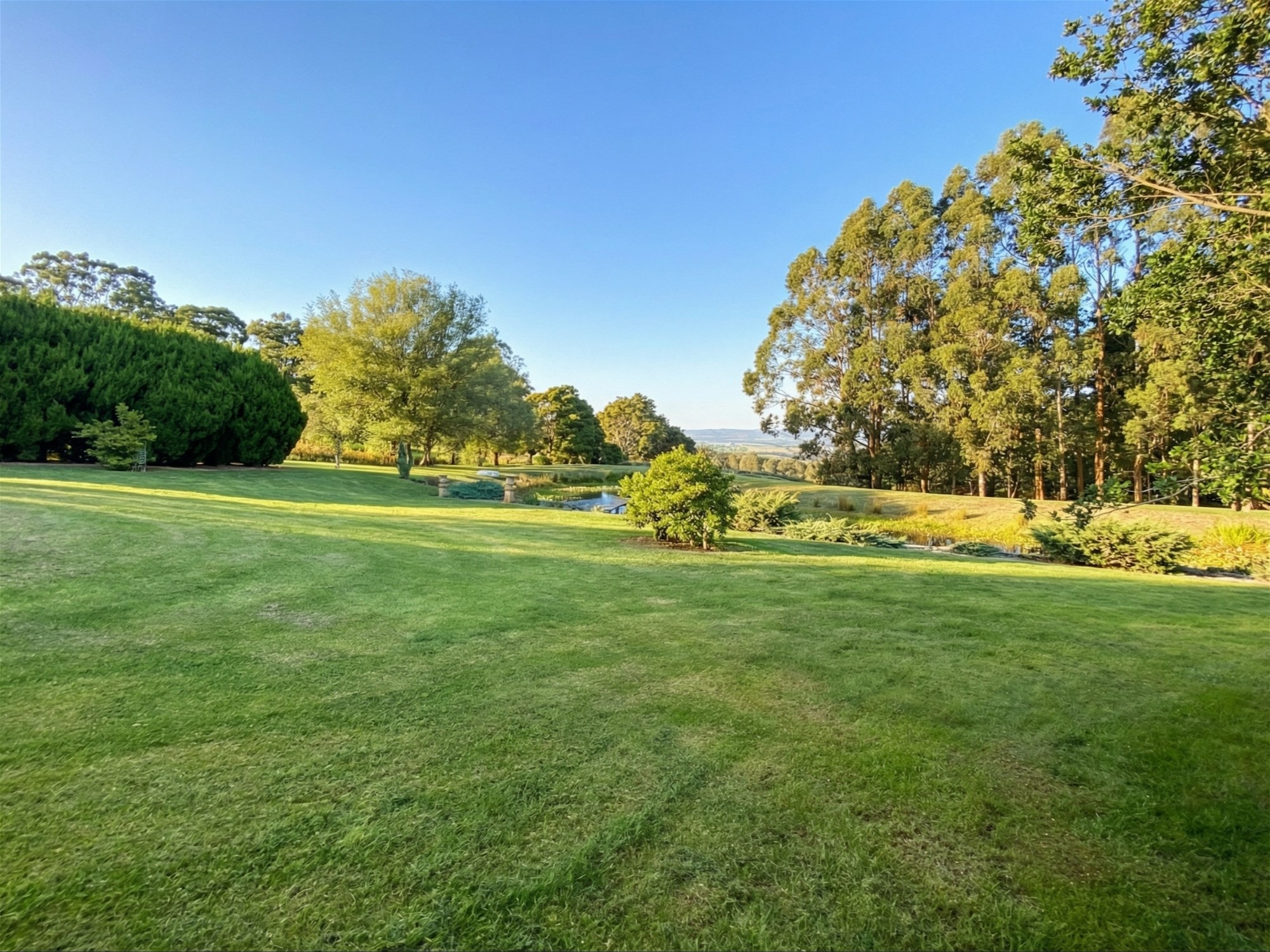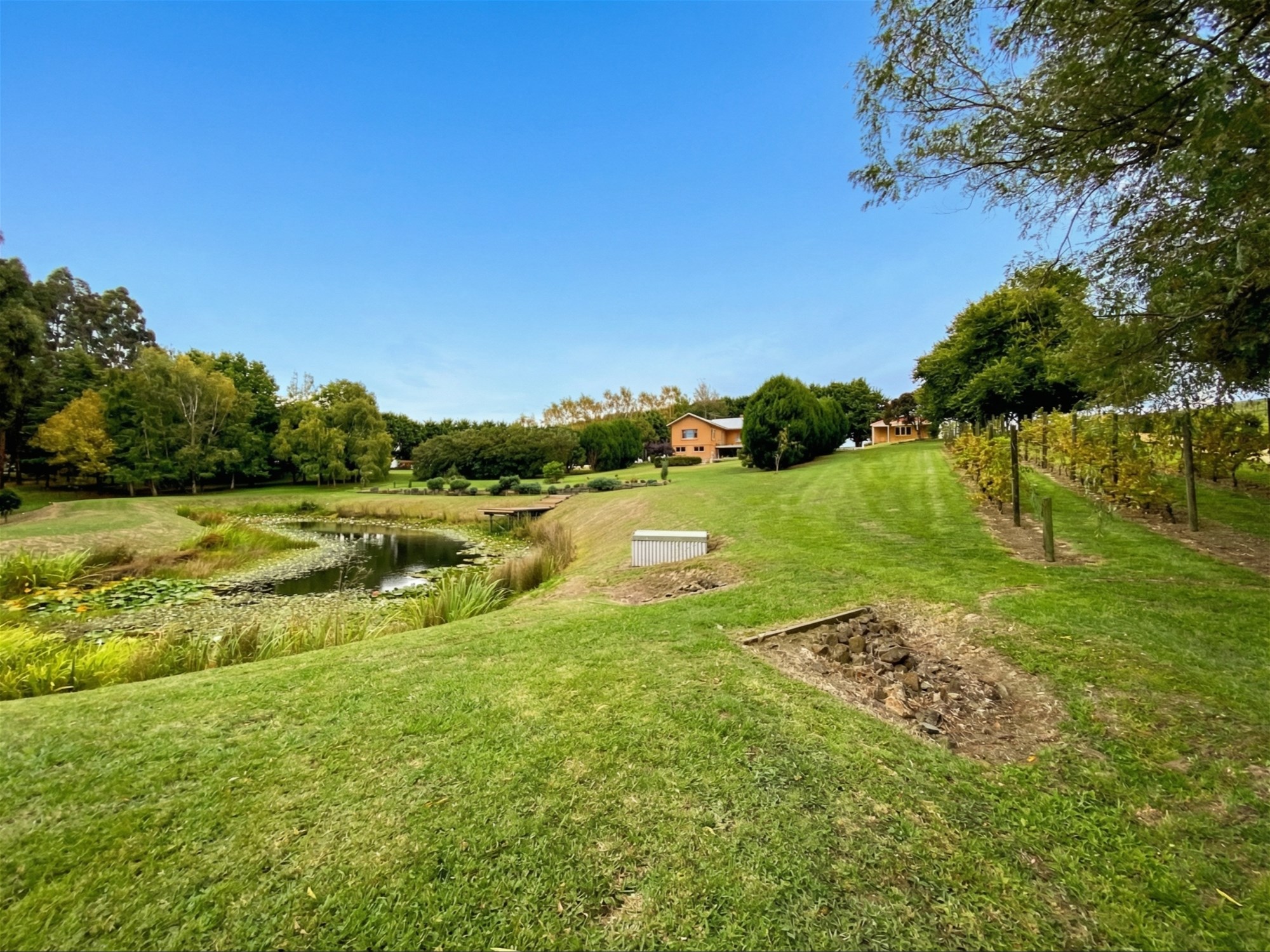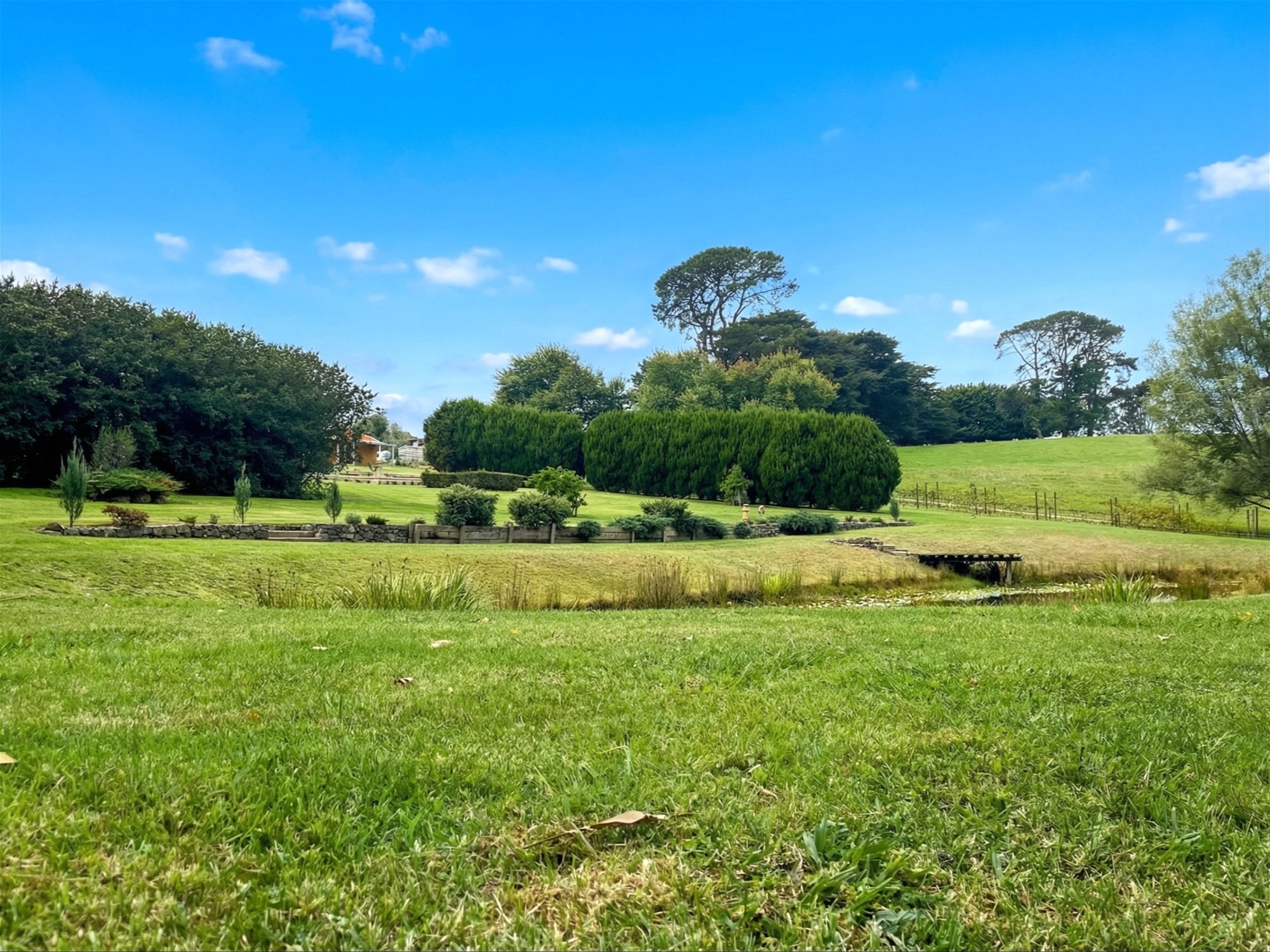 Beyond the residence, the grounds are a major part of the property’s appeal. Originally designed by renowned landscape architect Robert Boyle, the gardens unfold as a series of structured outdoor spaces framed by established hedging, mature cypress plantings and sweeping lawns. A Pinot Noir vineyard, citrus grove, espaliered apple trees and mature olive trees add beauty and productivity, while the picturesque dam and its merbau viewing deck create a focal point that feels both restful and memorable. The broader setting is one of maturity and calm, with the garden now carrying a sense of scale and permanence that newer plantings simply cannot offer.