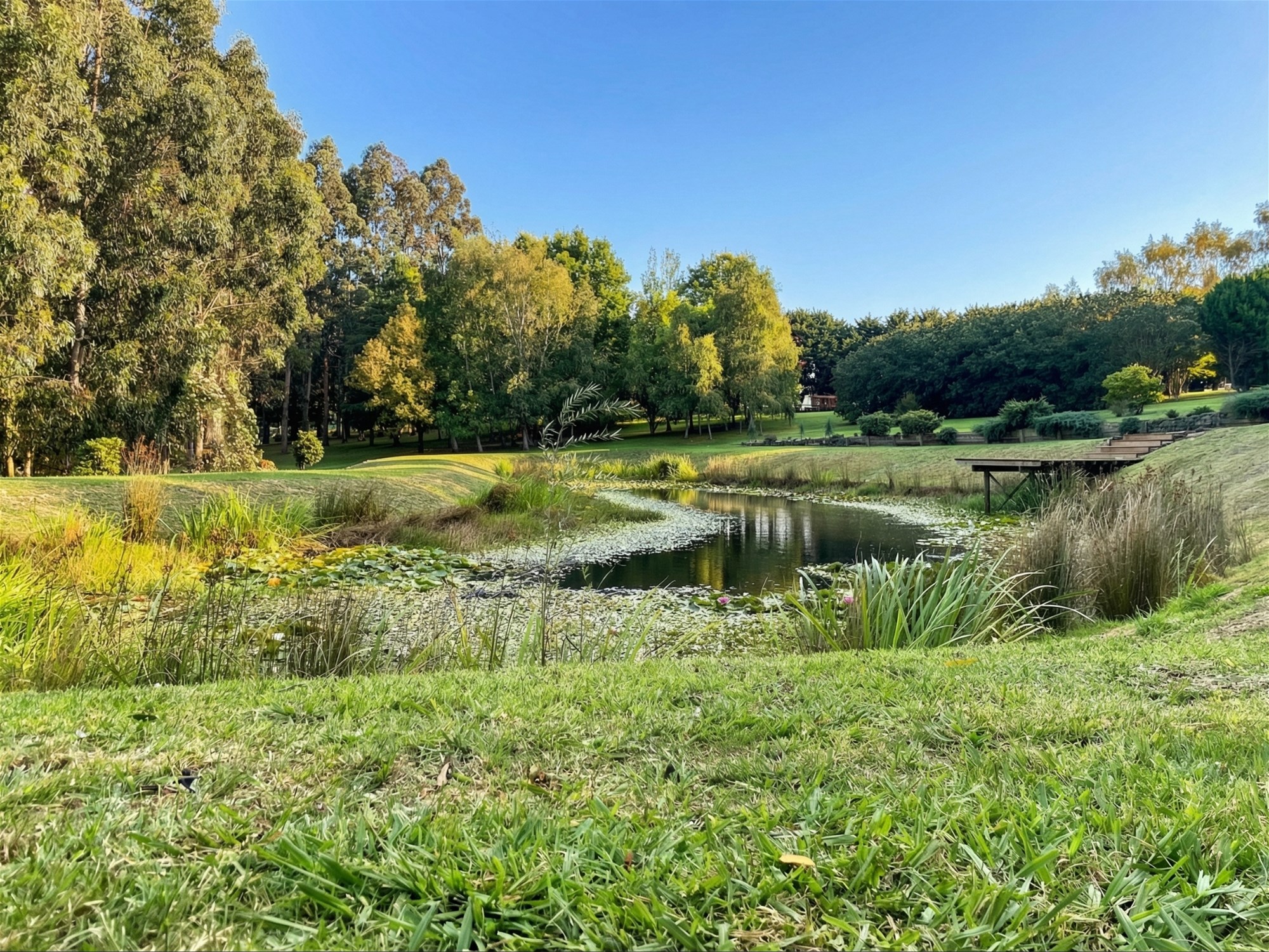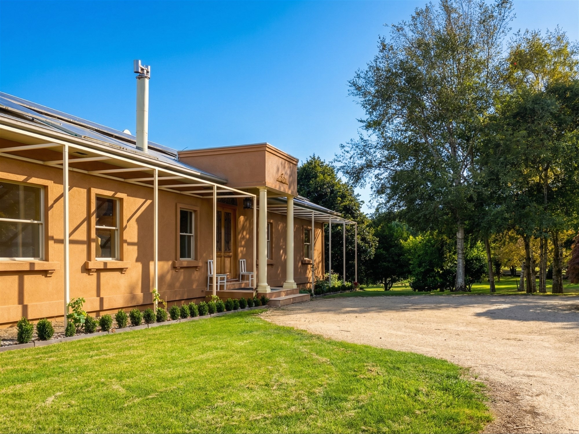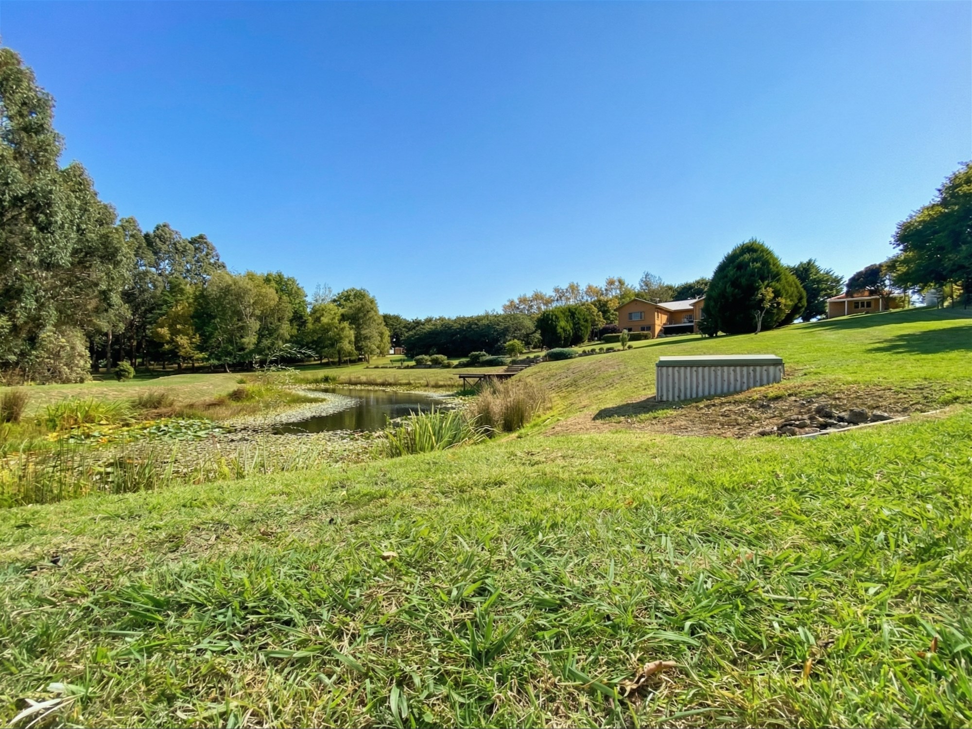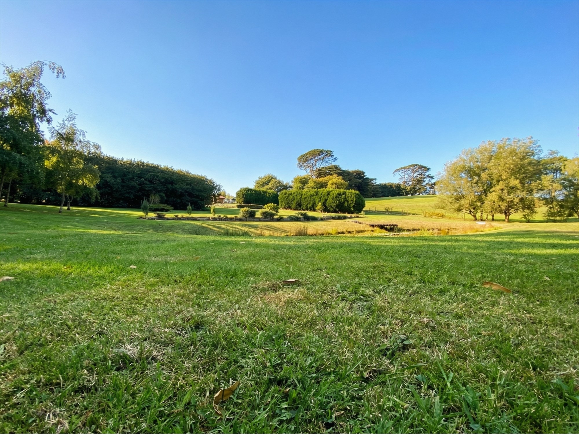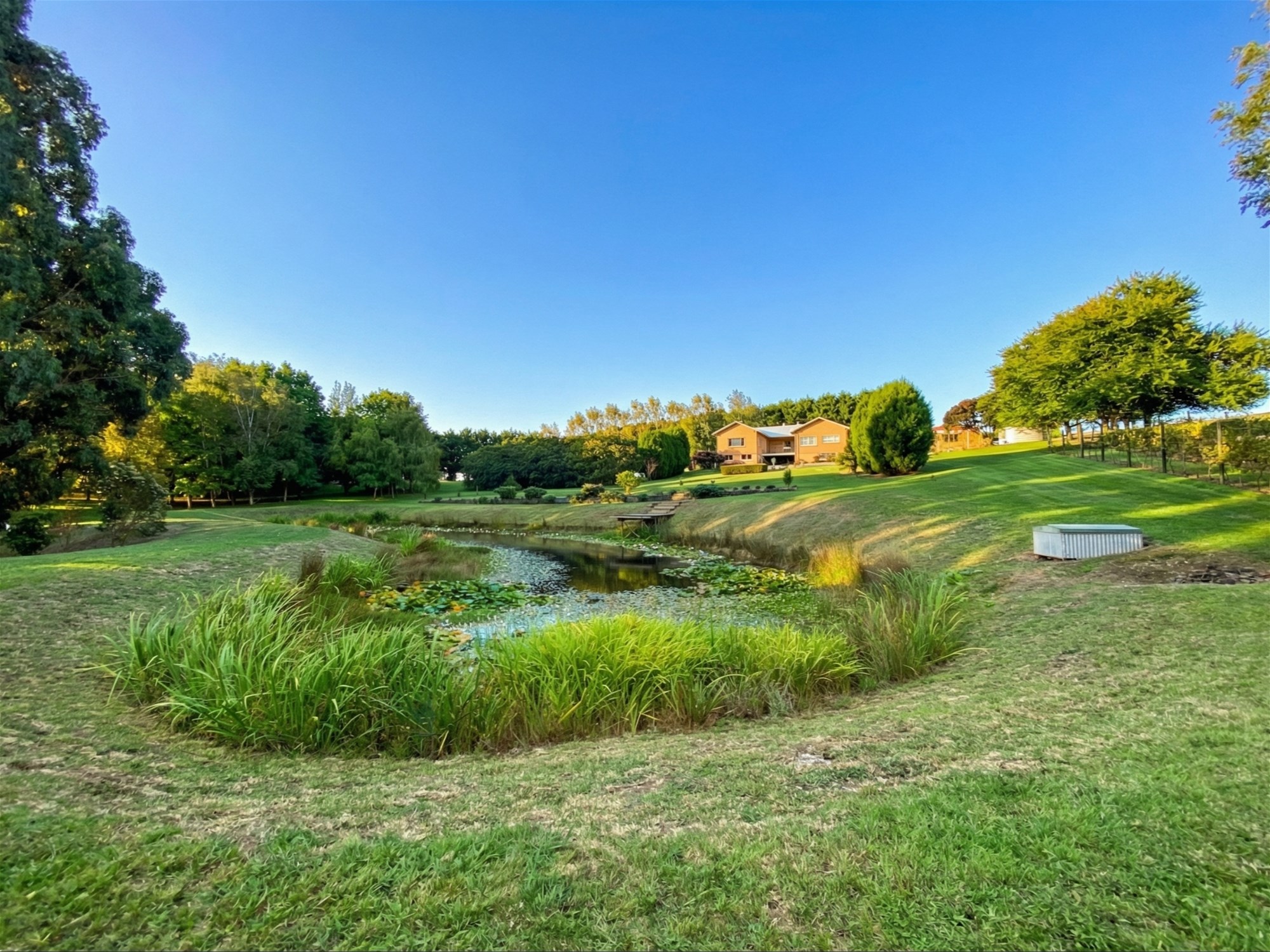 Beyond the residence, the grounds are a major part of the property’s appeal. Originally designed by renowned landscape architect Robert Boyle, the gardens unfold as a series of structured outdoor spaces framed by established hedging, mature cypress plantings and sweeping lawns. A Pinot Noir vineyard, citrus grove, espaliered apple trees and mature olive trees add beauty and productivity, while the picturesque dam and its merbau viewing deck create a focal point that feels both restful and memorable. The broader setting is one of maturity and calm, with the garden now carrying a sense of scale and permanence that newer plantings simply cannot offer.