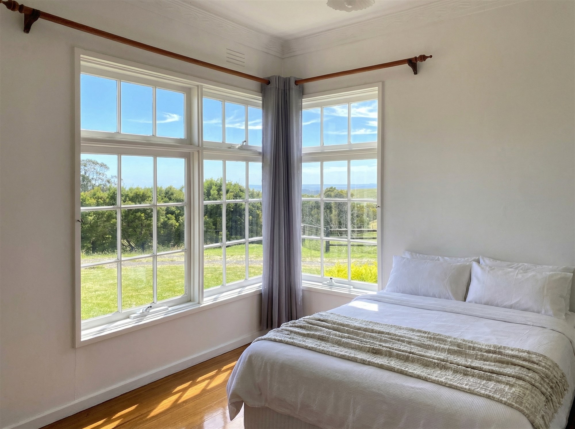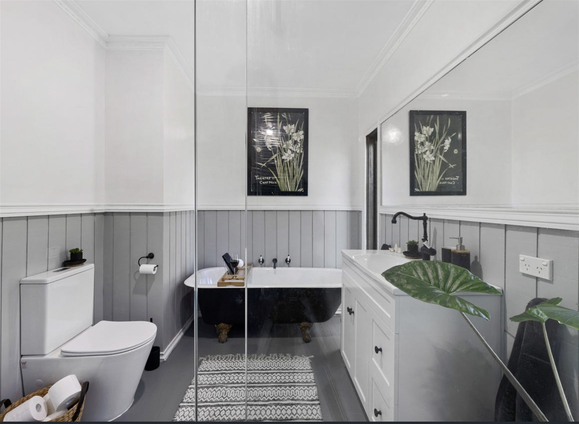 The accommodation wing is comprised of three spacious bedrooms, each designed as a private retreat. Fitted with built-in robes, these rooms are light-filled sanctuaries that continue the theme of rural serenity. They are serviced by a central bathroom that reinforces the home's heritage-inspired aesthetic, featuring a classic claw-foot bath that invites long, restorative soaks after a day spent in the garden or exploring the nearby national parks.