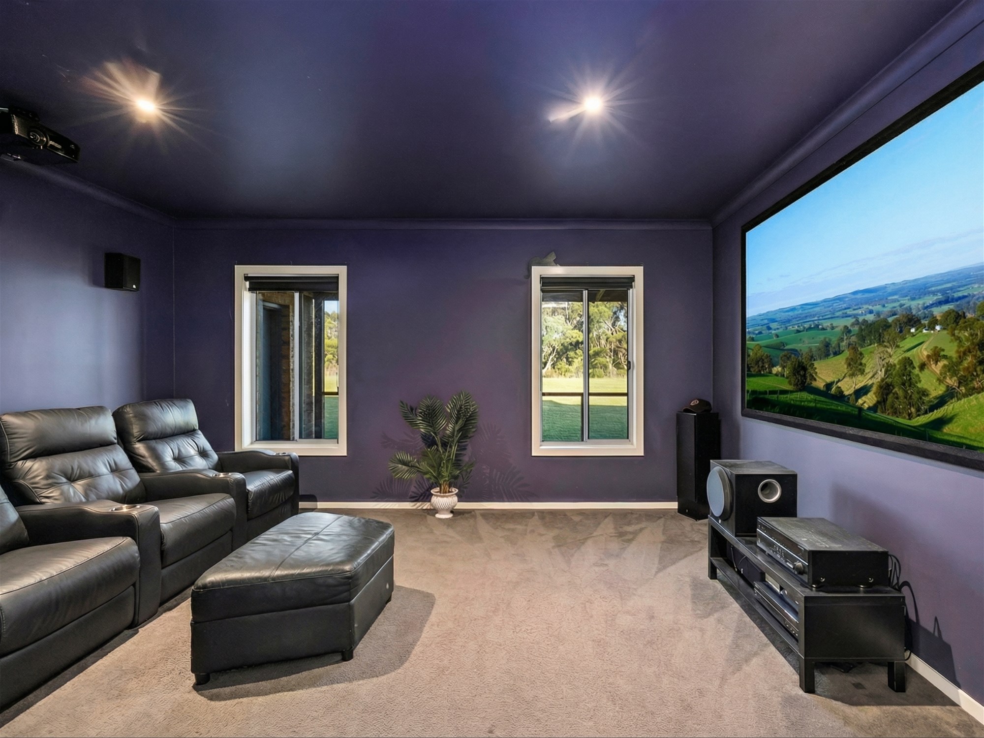 Step inside to discover a home that goes above and beyond in providing spaces for both relaxation and entertainment. The state-of-the-art theatre room, located just off the entrance hall, is the ultimate cinephile's haven, offering an unparalleled cinematic experience. Flowing through the kitchen, dining, and living areas, you'll find the outdoor undercover deck, where a rustic, fully-equipped bar awaits. Featuring beer taps, a wooden countertop, and ample shelving for your favourite spirits and glassware, this space is perfect for hosting gatherings or enjoying a quiet drink while taking in the surrounding views.