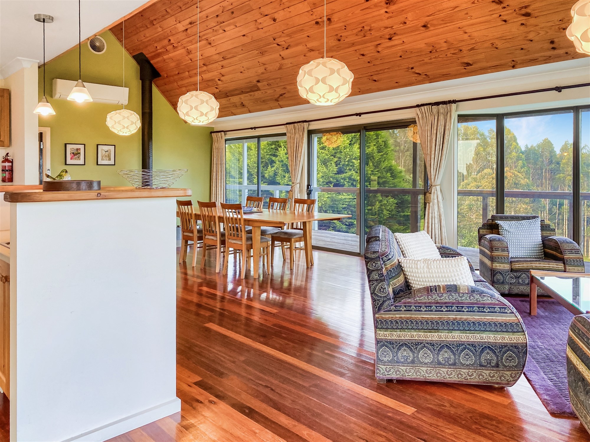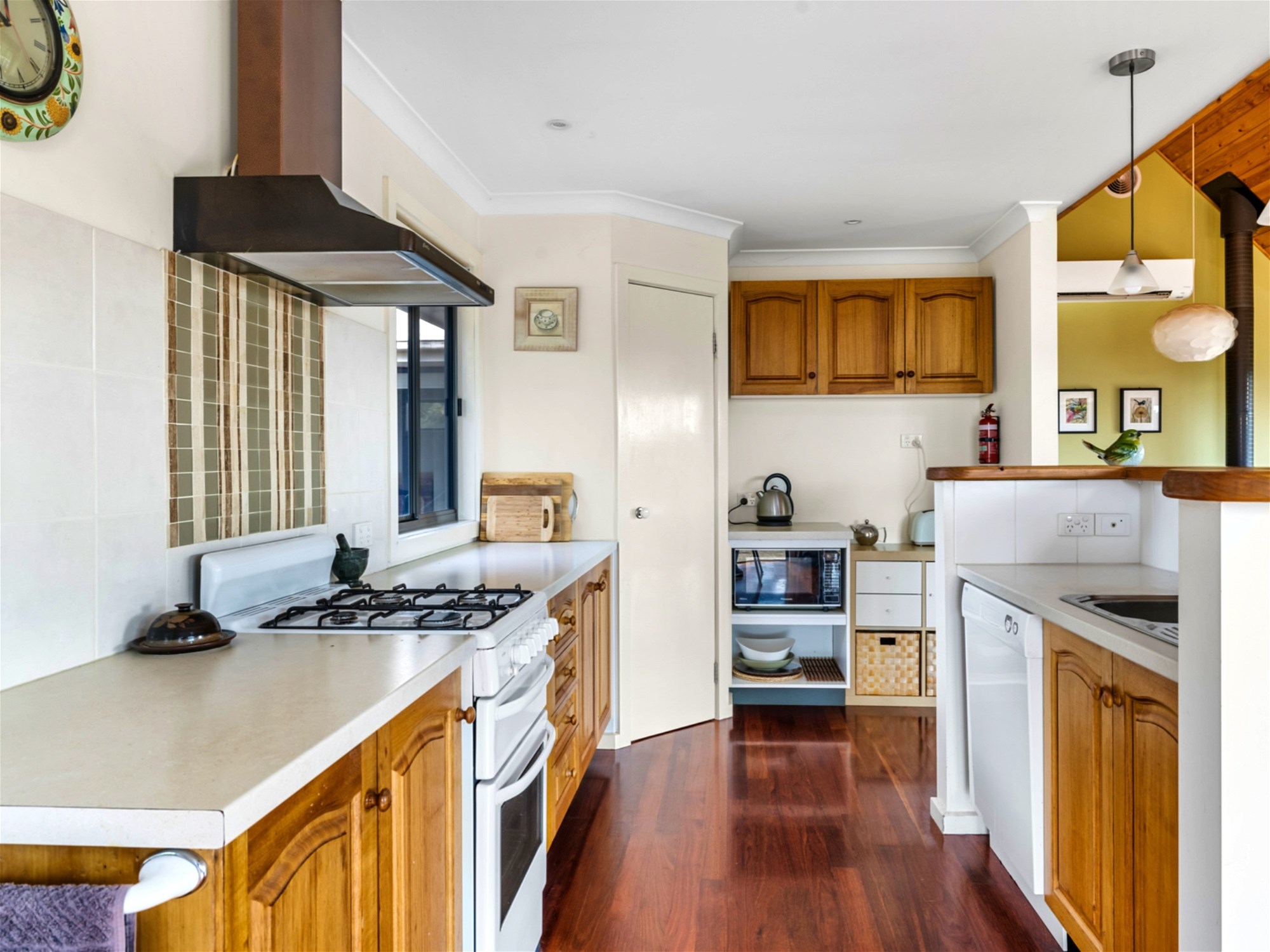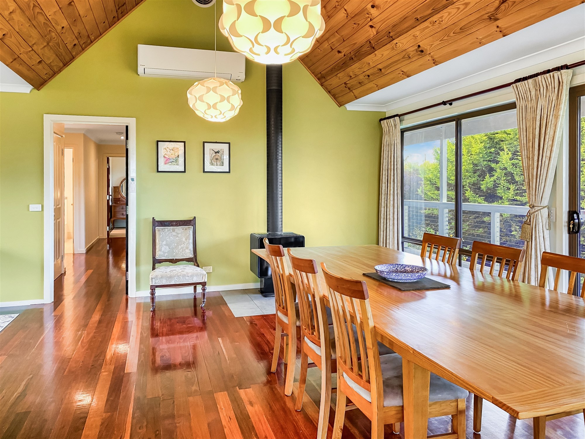 From the moment you step inside, the light and warmth of the home are immediate. Polished timber floors lead through expansive open-plan living and dining areas where full-height windows draw the landscape indoors. The vaulted ceilings add a sense of scale while framing spectacular sunsets over the hills. A wood heater and reverse-cycle climate control ensure year-round comfort, and the seamless connection between interior and exterior spaces makes entertaining effortless. The kitchen is both stylish and functional, with a walk-in pantry, gas cooking, dishwasher and island bench, all perfectly positioned to take in the surrounding views.