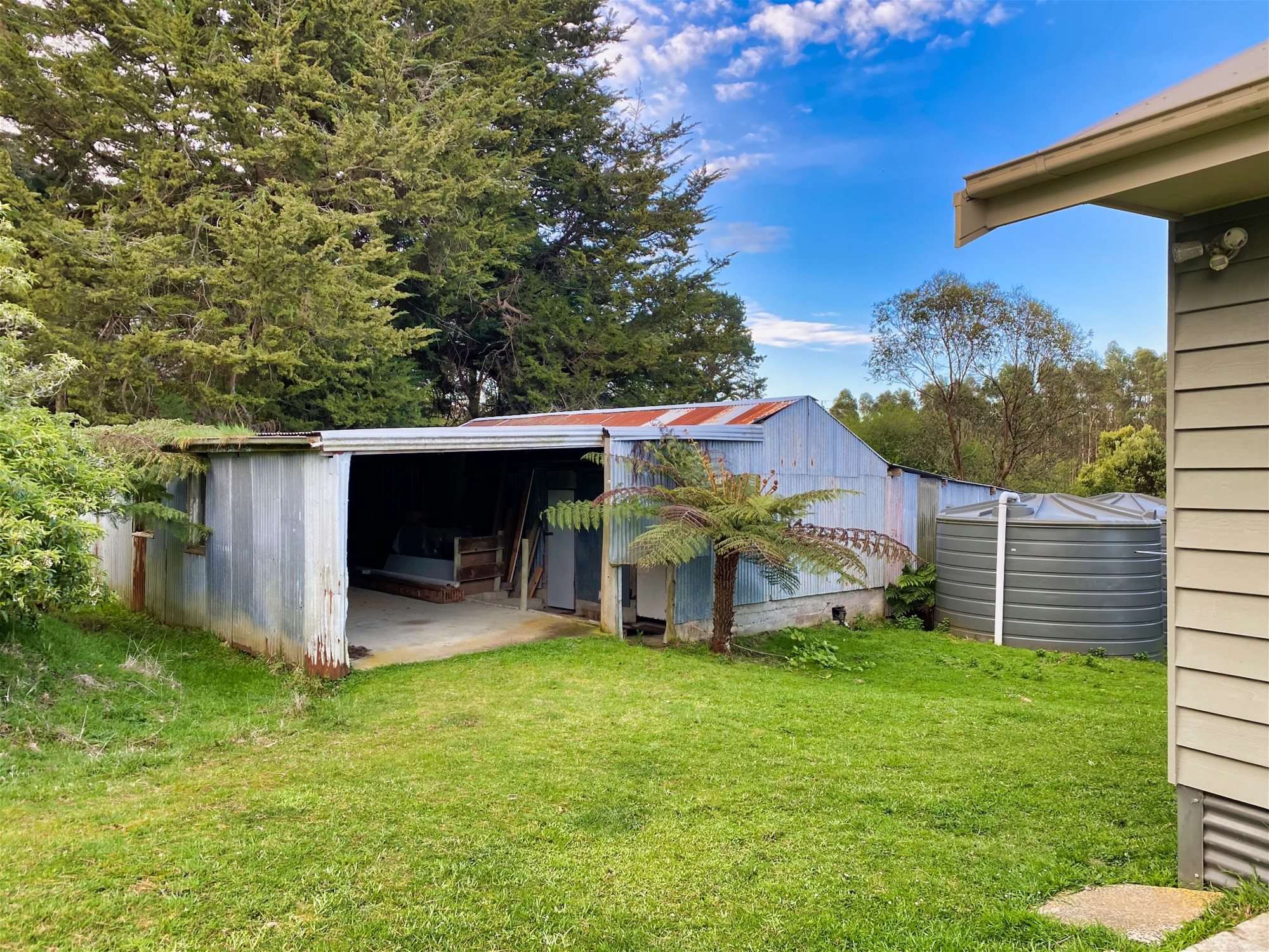 The master suite opens directly onto the veranda and features a walk-in robe and ensuite, while the remaining bedrooms, each with views across the countryside, are supported by a well-appointed family bathroom. A dedicated home office sits adjacent to the internal entry from the garage, offering flexibility for work or creative pursuits. Across the property, two large water tanks, established fruit trees and a character-filled shearing shed contribute to its practical charm, all set within easily maintained gardens that complement the natural contours of the land.